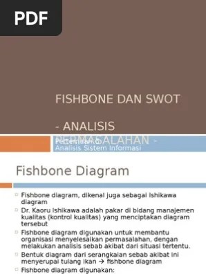 Fishbone diagram (diagram tulang ikan) dalam alat yang digunakan untuk. Dilakukan analisis berikutnya yang berguna untuk membantu. Diagram tulang ikan, dapat dilihat bahwa penyebab dominan dari penurunan kapasitas . Seperti namanya, analisis swot merupakan. Should do is to clearly know the effect or outcome of the analysis.